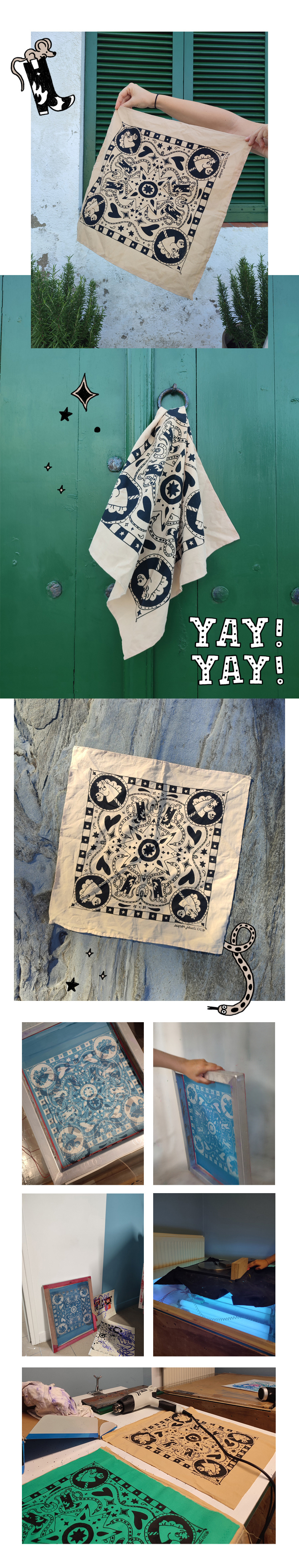 Illustration of horses, mouses and snakes in the middle of the desert for the exposition "Friendz from the ouest coast" on a bandana. The design has been be printed in serigraphy by Zoé of @oze_graphisme and me on second hand fabric.