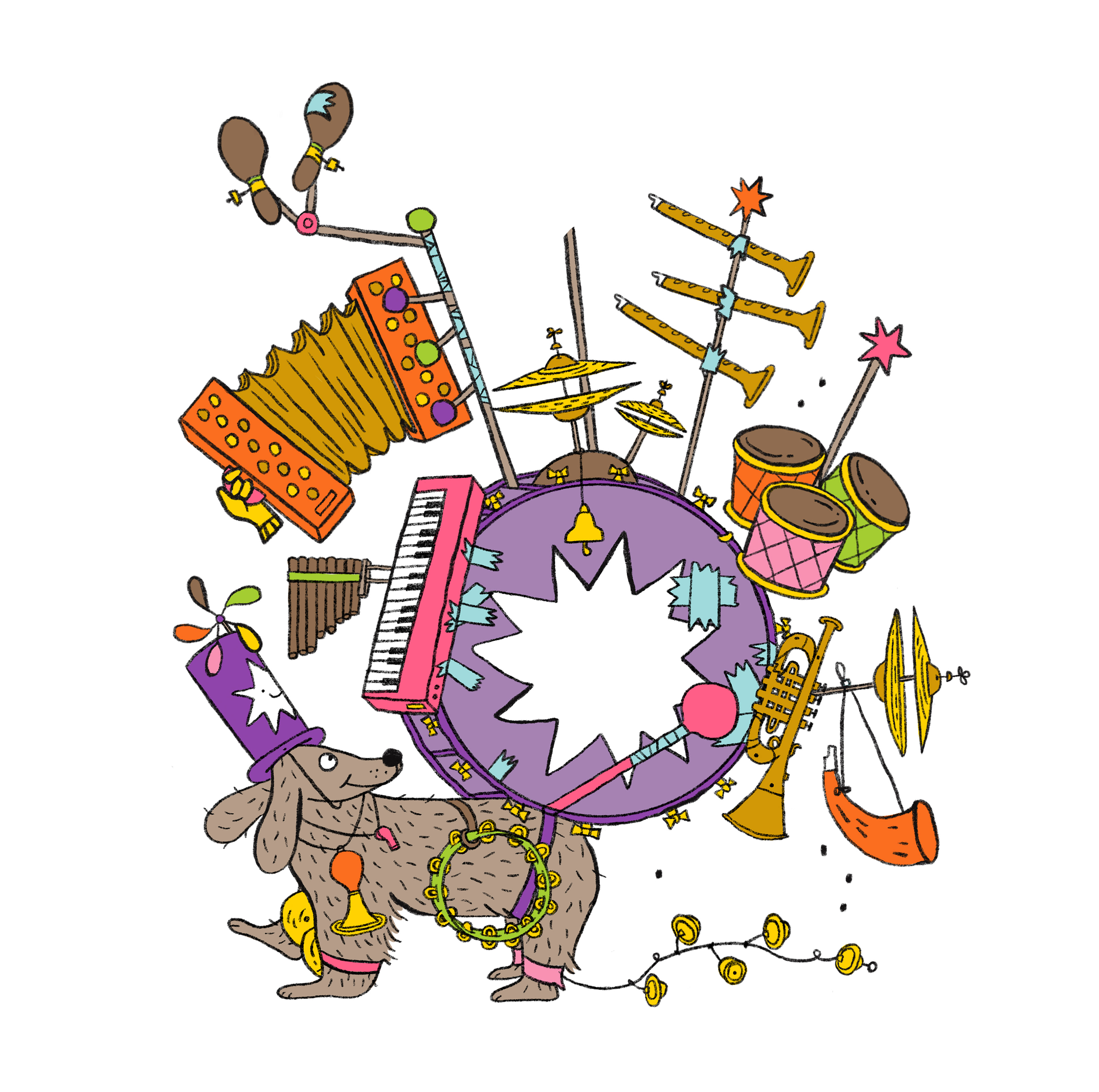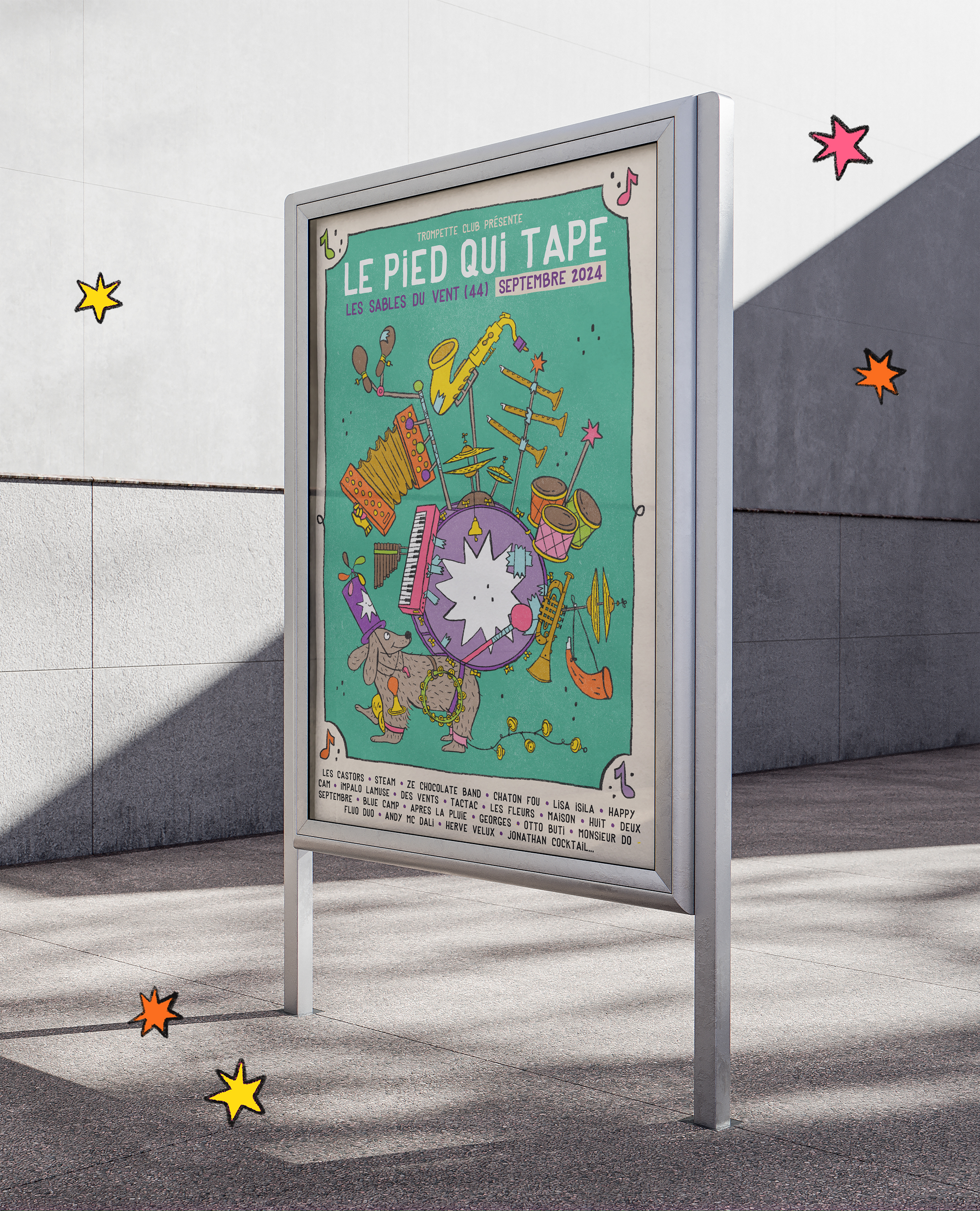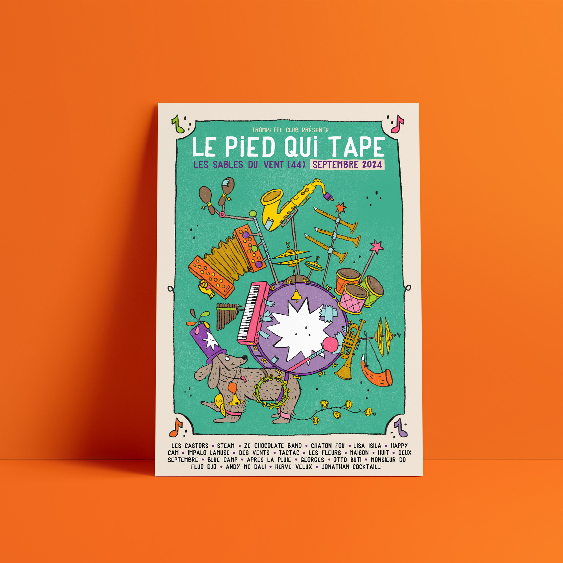 Un projet personnel d'illustration et graphisme pour un festival de musique qui se nomme "Le pied qui tape". Le chien orchestre nommé Badaboum y fait peut-être une apparition.